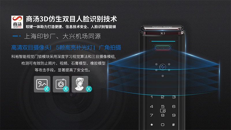 X3是科裕與商湯科技共同打造的新款人臉識別智能鎖,在信息安全上有更大的提升,采用了 3D 仿生雙目紅外攝像頭架構實現立體成像,結合商湯先進的活體檢測算法,有效地防止照片、視頻、人像、人皮面具等假面識別開門,大大地提升了用戶安全性。