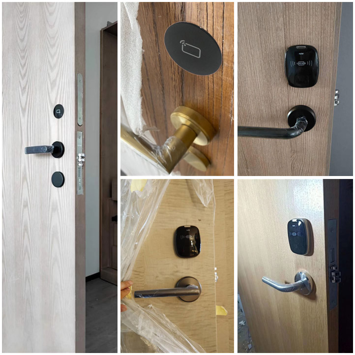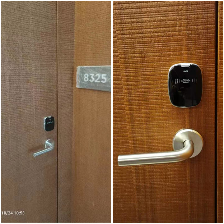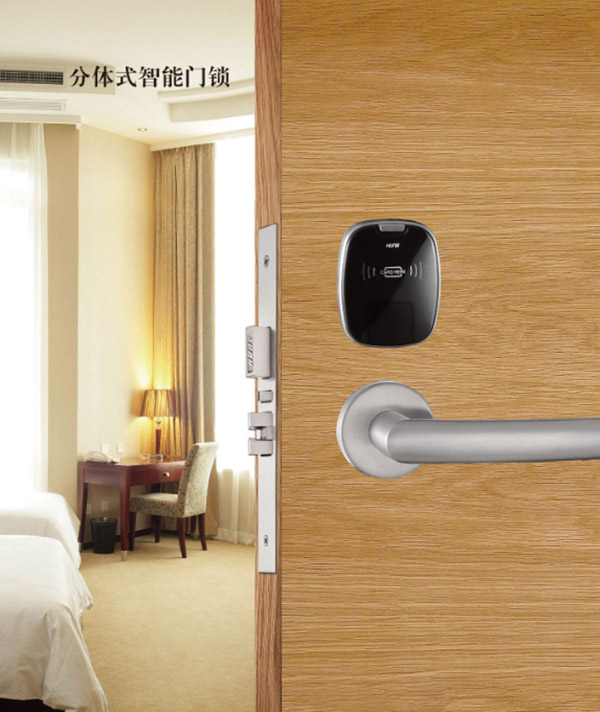 分體式智能門鎖的形狀款式和色彩都是千姿百態,總有一款會是你愛的樣子。像泰州逸安大酒店這樣,在白色的門的設計下黑色的分體門鎖,絕對是不錯的選擇。