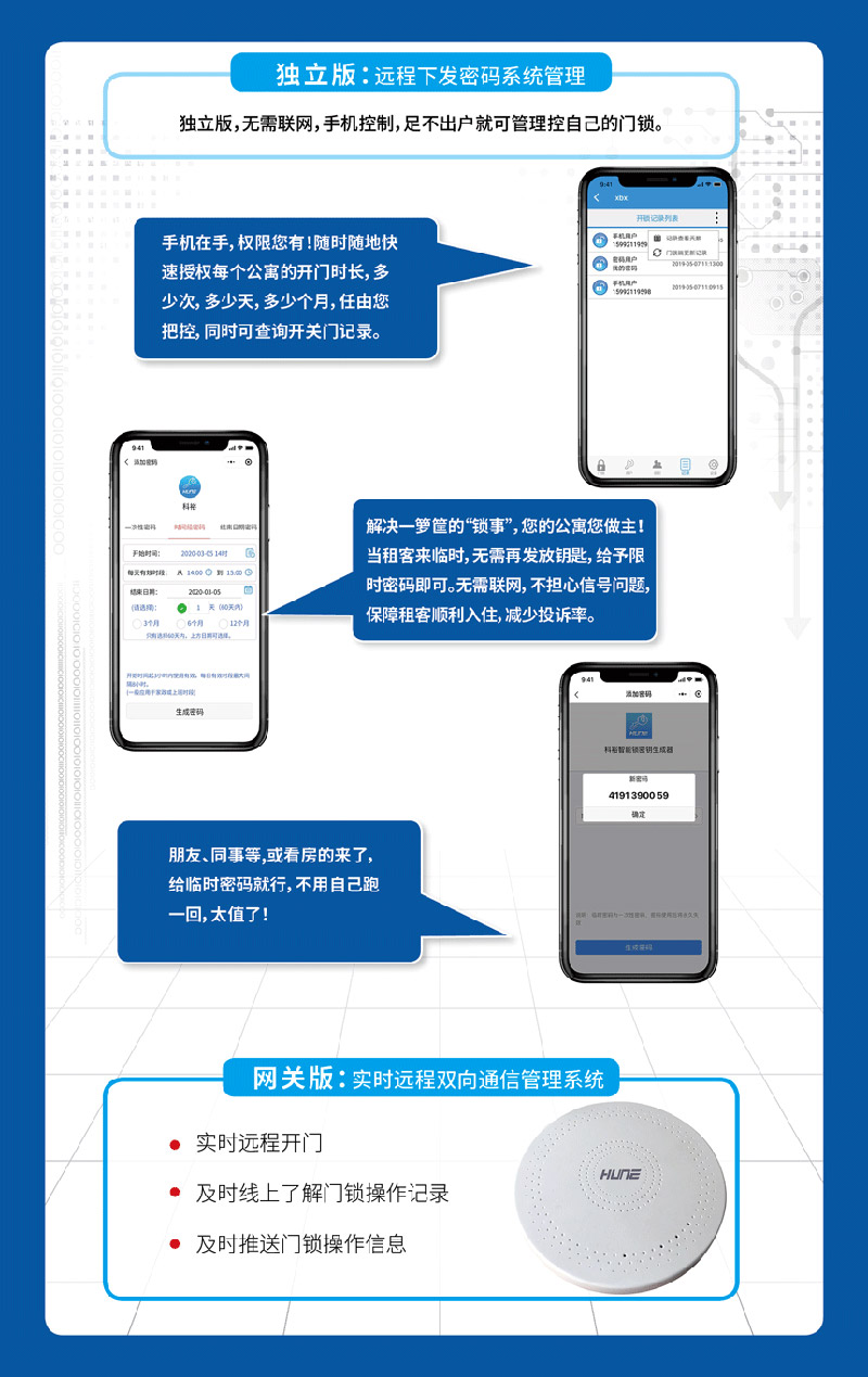 對于公寓、民宿、出租屋等租賃市場來說,智能化時代,用聯網智能門鎖確實會讓租賃的生活更加美好,讓公寓、出租屋、民宿等可以智能管理,省力更省心 。